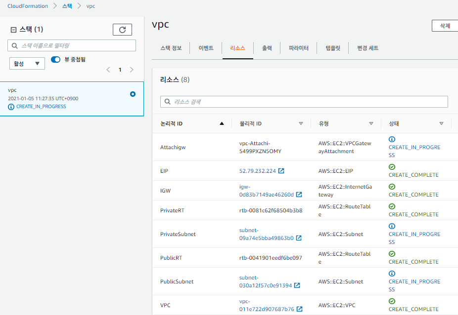 리소스들이 생성되고 있는걸 확인할 수 있다
