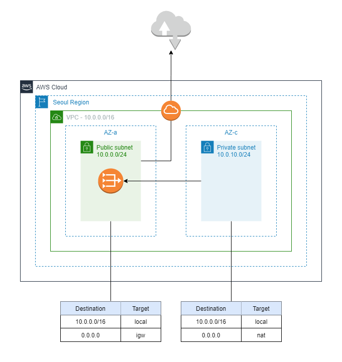 Public은 인터넷 게이트웨이랑, Private은 NAT랑 연결해줬다