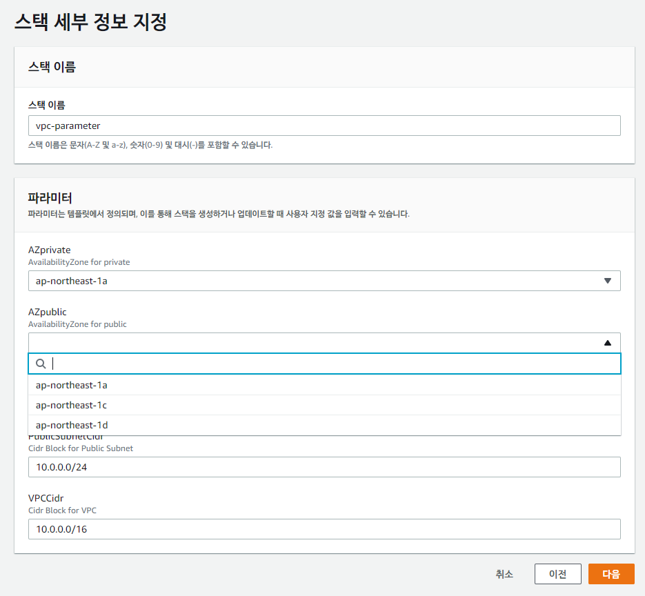 이 때 AZ 파라미터는 값을 따로 정해주진 않았는데, 이런 애들은 AWS-specific parameter types라고 템플릿을 구성할 때 직접 선택할 수 있다