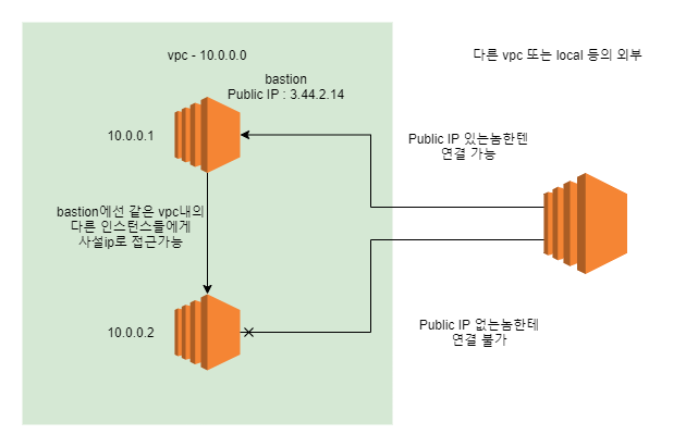 Bastion Server로 접속할 수만 있으면, 그 Bastion이 속한 VPC 내의 서버들에게 사설 IP로 접근할 수 있기 때문에 Bastion을 제외한 애들은 공인 IP를 가질 필요가 없다