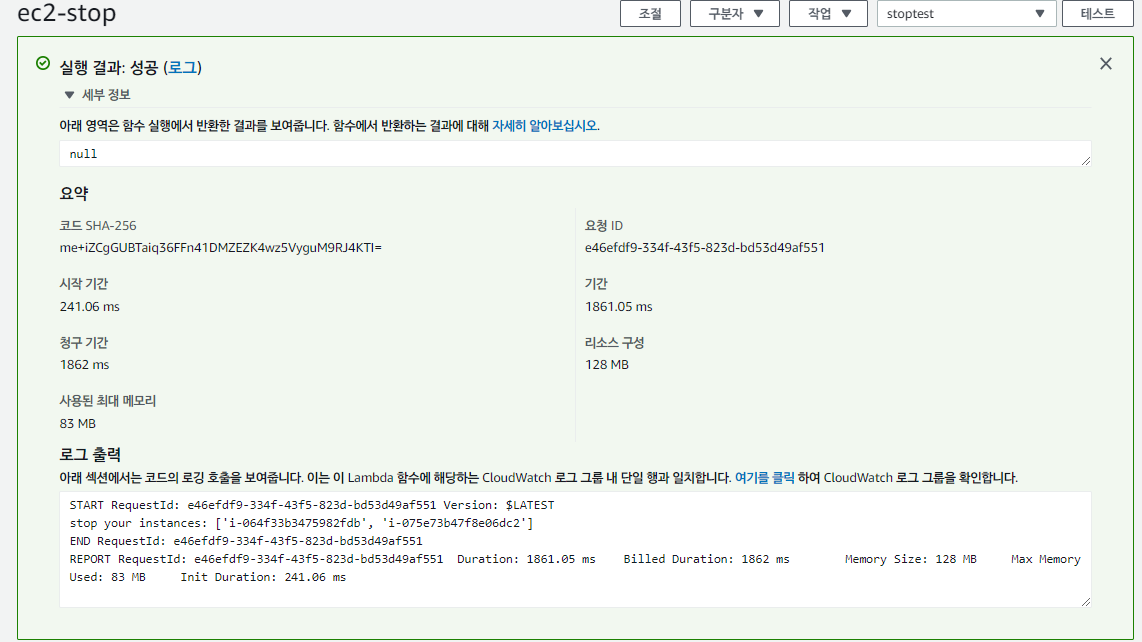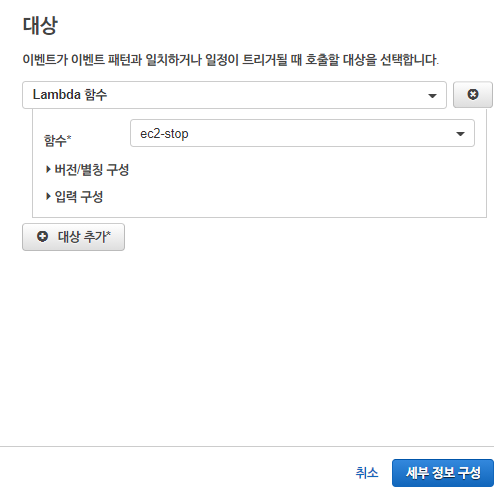 그리고 대상 추가를 눌러 ec2-stop 함수를 선택해준 후 세부 정보 구성을 누른다