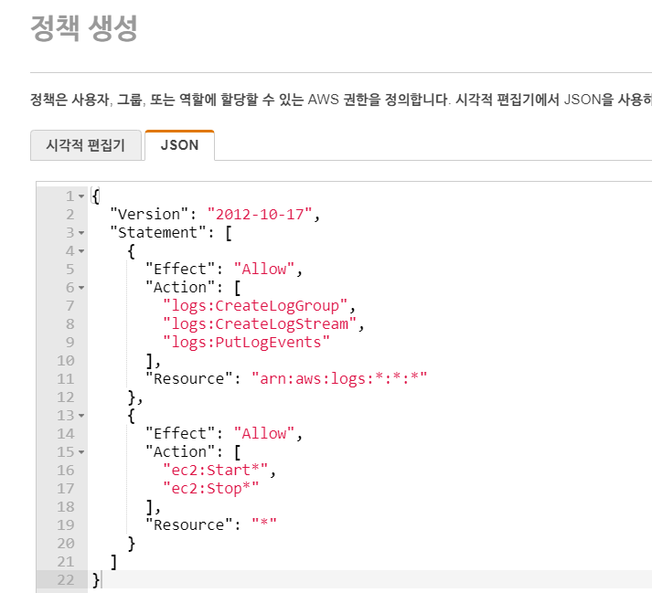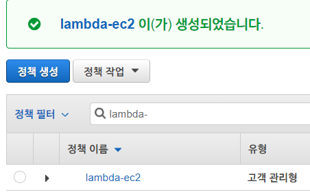 Lambda 함수에서 EC2를 시작/중지 시킬 수 있는 role을 만들어야 하기 때문에 정책을 먼저 만들어주겠다