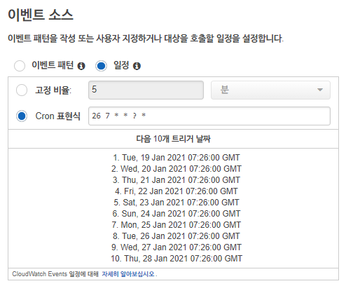 이벤트 소스에서 일정을 누른 후 Cron 표현식을 선택해주자