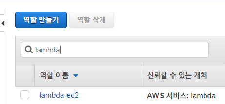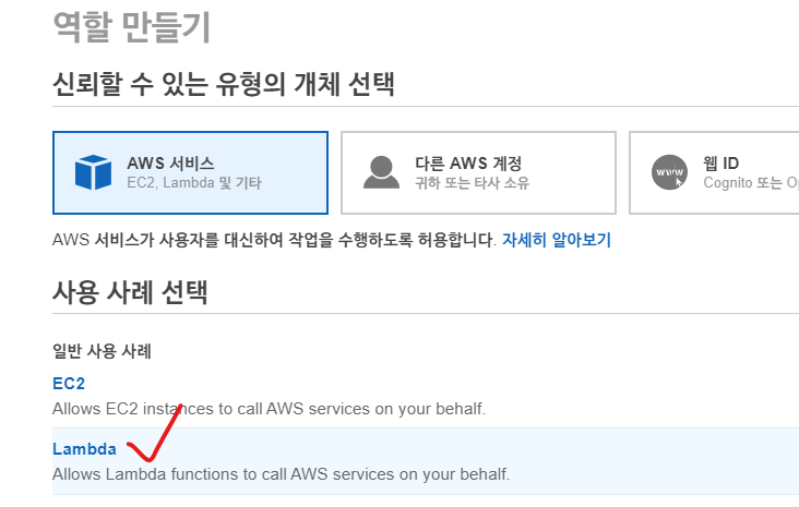 IAM > 역할 > 역할 만들기 > 사용사례에서 Lambda 선택 > 다음