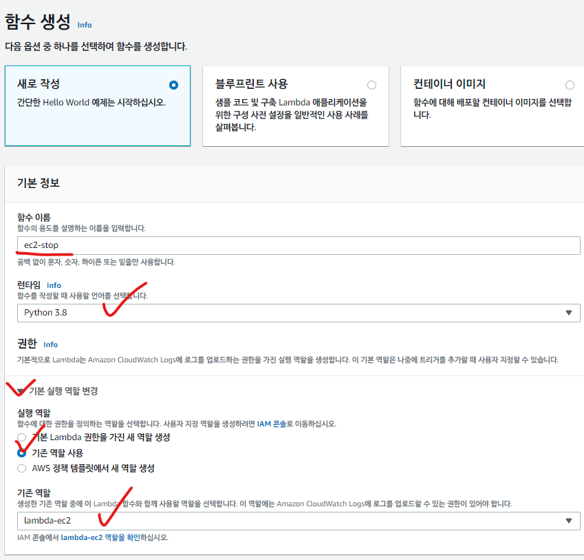 이름 설정해주고 Python으로 설정, 기존 역할 사용 > 방금 만든 역할 선택 후 함수 생성